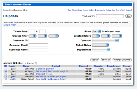 Each help desk ticket is represented as a bulletin board topic. All entries include header field showing who, when and from where in the world posted the message. The Smart Answer supports all the conventional features of online bulleting boards are fully supported: