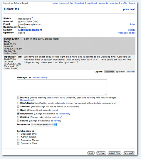 Operator may also post hidden messages to facilitate ticket notes and annotations, transfer ticket to another operator and edit values of custom fields.
